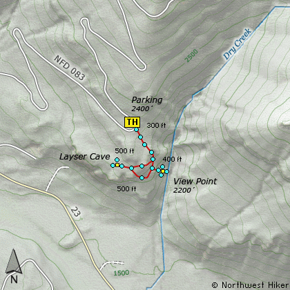 Travel east on US Hwy 12 for about 48 miles to Randle. From Randle, travel south on State Road 131, crossing the Cowlitz River and in a mile you will come to Cispus Road on your left. Bear left and follow Cispus Road, which become Forest Road 23, for another 5.2 miles and you will pass Forest Road 55 on your left. Continue on another mile and you will find Forest Road 083 on your left. Turn left onto FR083 and follow it uphill for about 1.2 miles. You will come to a large sweeping switchback, where you can park in the inside area of the switchback. The trailhead for this hike is just across the road.