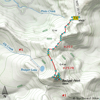 The trail now descends again a couple hundred feet in elevation. At that point it meets Trail #257A which takes you to the top of Badger Peak. The trail is steep but well maintained. Watch for snow as late as mid-July.