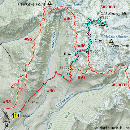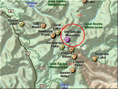 Upon reaching the PCT, you follow it north until you reach the pass on the northwest flank of Old Snowy itself. From there you follow a users trail to the top.