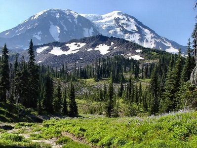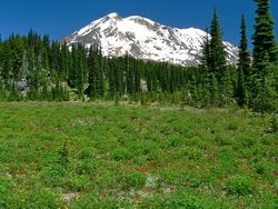 Second in height only to Mount Rainier statewide, 12,276-foot Mount Adams looms over at least 10 impressive glaciers and a Wilderness of forested slopes and subalpine meadows. The huge volcanic bulk of the mountain takes up a considerable portion of the Wilderness and rises to its only peak. As many as 25 climbing routes, from nontechnical to technically challenging, provide access to this very popular summit. Elevation gain is approximately 7,000 feet. Approaching the mountain from the south you will find relatively gentle terrain, a nice contrast for hikers in comparison to the treacherous ice and sharp ridges on the west and the treacherous ice and vertical cliffs on the east. The glaciated north face is less imposing. The eastern half of the mountain lies within the Yakama Indian Reservation.