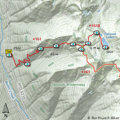 Travel east on US Hwy 12 for about 64 miles to Packwood. As you continue eastbound on US Hwy 12 through Packwood, near the east end of the town, you will come to the junction of Forest Road 52 on your left. Follow FR52 west across the Cowlitz River, and uphill out of the valley for about 4.1 miles. You will then come to the junction with Forest Road 5270 on your right. Bear right and follow FR5270 for about 5.6 miles where it is just about to cross Butter Creek. Bear right onto Forest Road 5272 and follow this road for about 1.4 miles and you will find the trailhead for both Tatoosh Wilderness hikes on your right.
