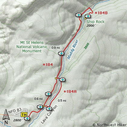 In about a mile, after crossing a couple small streams, and descending a tall steep ladder, you will come to a junction to Trail #184B. Follow this trail uphill and up another short but steep ladder to the top of Ship Rock. Here you will enjoy excellent views of Lava Canyon and several of its waterfalls.