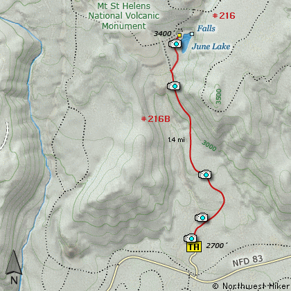 From the junction with I-5 follow SR503 east from Woodland, WA approximately 23 miles to the junction of the Lewis River Road with SR503. Continue east on the Lewis River Road another 4.4 miles to the junction of Forest Road 81 just before you get to Cougar. Continue east through Cougar on the Lewis River Road, which becomes Forest Road 90, for about 7.4 miles to the junction of Forest Roads 90 and 83. Turn left on FR83. In about 1.7 miles you will pass the road that leads to the Ape Caves, but continue north on FR83. In another 1.3 miles you will come to the junction to Forest Road 81. Continue on FR83 for another 3.8 miles you will come to the parking area for the June Lake hike.