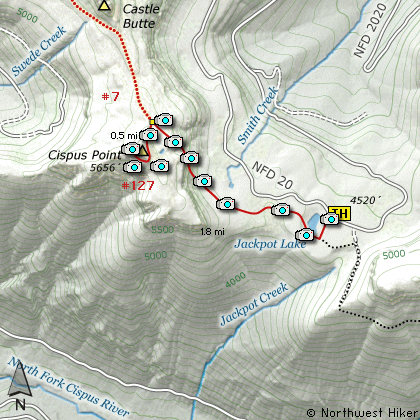 Travel east on US Hwy 12 for about 48 miles to Randle. From Randle travel east on US Hwy 12 for about 12.5 miles to the junction with Forest Road 20. Turn right (south) onto FR20 and follow it uphill for about 4.3 miles. At this point you will see a road continuing straight ahead, but stay on FR20 and follow it to the left over the creek and continue on past the trailhead to Southpoint Mtn. for another 8.1 miles to the trailhead to Jackpot Lake and Cispus Point.