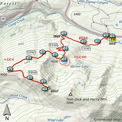 Just before reaching Mirror Lake you intersect the loop trail that goes around the lake. Keep to the right to avoid following the lake loop trail, and you will pass by the north side of the lake. If you are looking to take the reflective photo of Mount Hood in Mirror Lake, you will need to travel around the lake. After Mirror Lake, the trail to the top of Tom Dick and Harry Mountain climbs gently over the next mile.