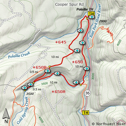 Follow Oregon Hwy 35 south of Hood River or north from Hwy 26 near Government Camp until you come to the road to Cooper Spur. Just a hundred feet south of that junction on the east side of Hwy 35 is the parking area for the Polallie Trailhead. To access the trail you have to walk across the highway, so be careful.