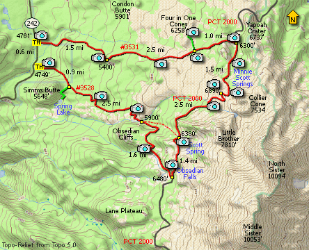 In a little over a mile and a half you will come to the junction of the Glacier Way cutoff trial that you passed earlier on the PCT. The trail crosses the creek and climbs a bit to get over a rather large lava flow. There will be numerous opportunities for great photos of the Sisters behind you as you decend, so be sure to look back over your shoulder.