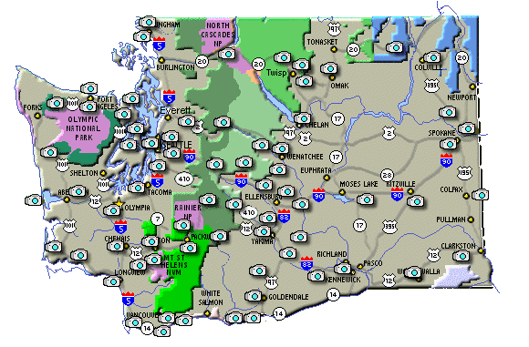 SR 24 and SR 241 Junction Mt St Helens Volcano Cam Long Beach Cam White Pass web cam Satus Pass web cam Goldendale Cam Snoqualmie Pass web cam Stevens Pass web cam Hood Canal Bridge web cam Spokane web cam Twisp, Washington web cam Methow Valley Airport web cam Bellingham web cam Seattle web cam from Space Needle I-405 near Kirkland Hurricane Ridge web cam Port Angeles Airport web cam Blewett Pass web cam I-5 web cam Vancouver web cam Tacoma web cam Wenatchee web cam Lake Chelan web cam Crystal Mt Ski Cams Mission Ridge Ski Resort Cam Colfax, WA Westport, Washington HR14 at Cape Horn Stevenson Webcam Leavenworth, Washington Morton, Washington Alpowa Hills Blaine Peace Park Dale Irelands webcam Ryegrass Summit Elk Heights Manastash Summit Clayton Olympia Airport View US 101 near Diamond Olympic National Park Webcam on Lake Crescent Walla Walla area Mt Spokane, Washington Wishram, Washington Yakima, Washington Richland, Washington Sherman Pass, Washington Colville, Washington Ritzville, Washington Hwy 101 near Aberdeen Mary Hill US 97 and WA 14 Longview, Washington Omak, Washington Moses Lake, Washington Ross Lake, Washington Mt Rainier National Park Packwood Airport Hwy 101 near Queets KM Mountain Snohomish Airport Port Townsend, Washington Whistlin Jack's Lodge St. Helens Learning Center Chehalis Airport Bellevue, Washington Zilla, Washington Loup Loup Pass Ellensburg White Salmon Webcam